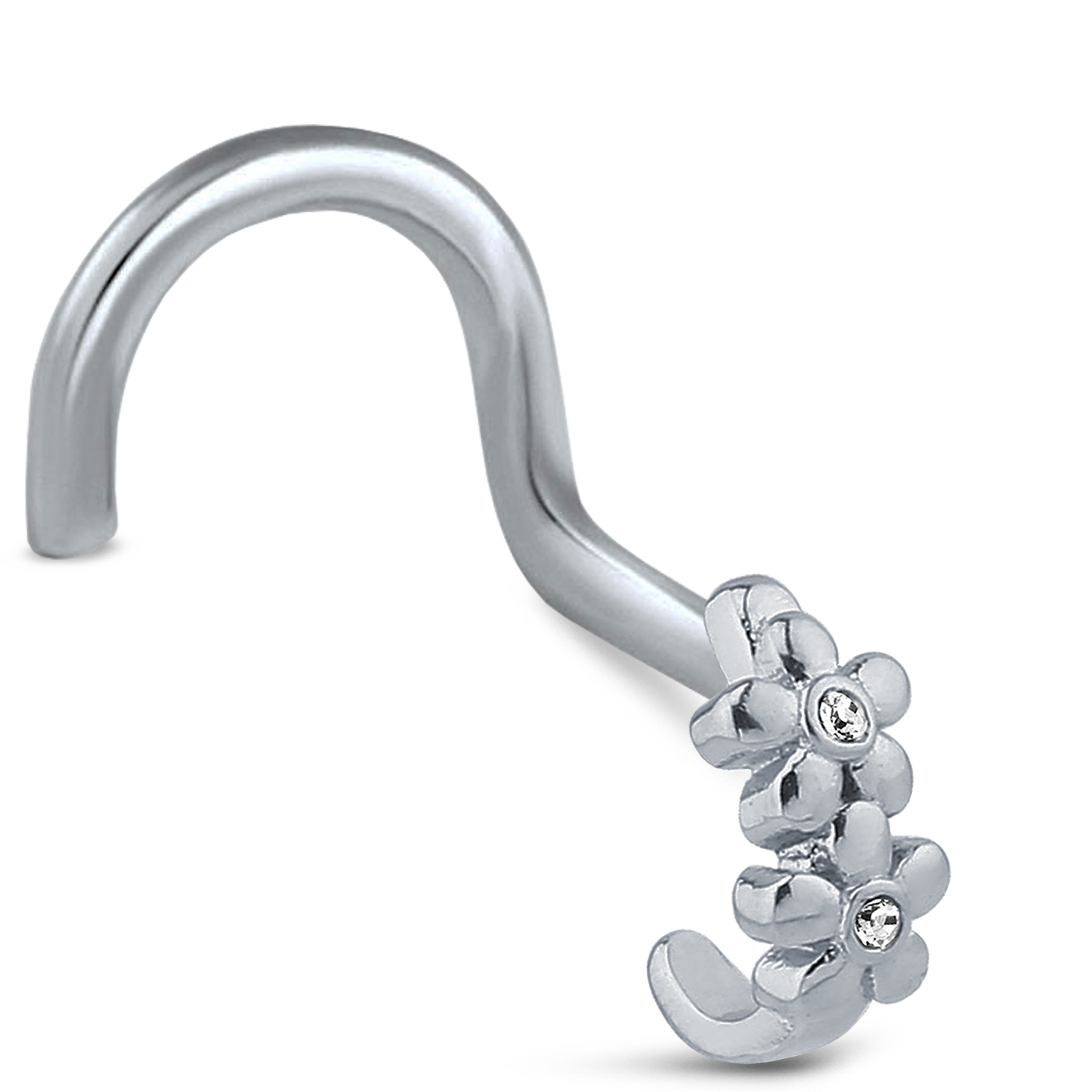 This surgical steel nose hugger wraps around the inside of the nostril and features a double flower design with a sparkling CZ stone.