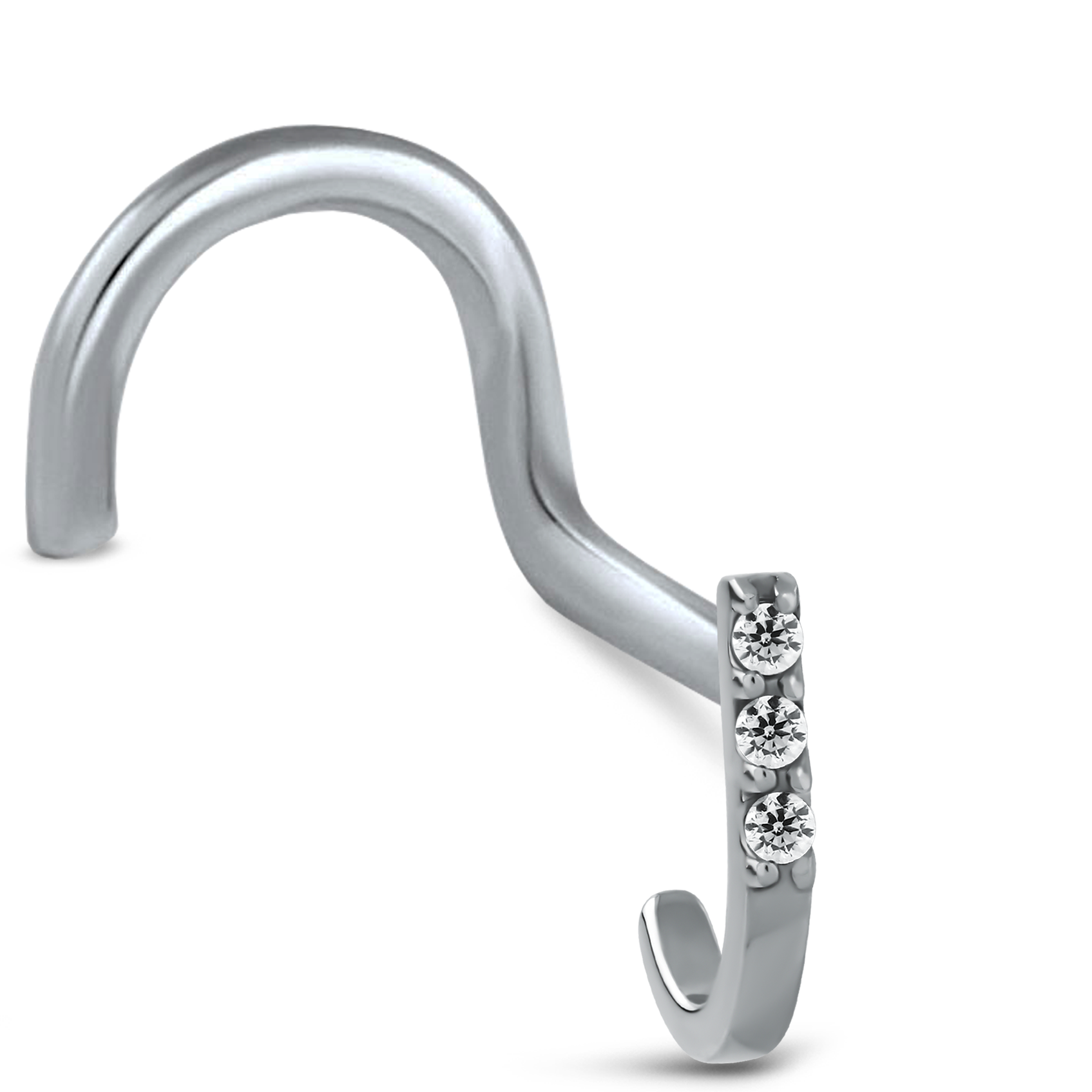 This sleek surgical steel nose hugger features a triple CZ stone design that wraps around the inside of the nostril for a refined and stylish look.